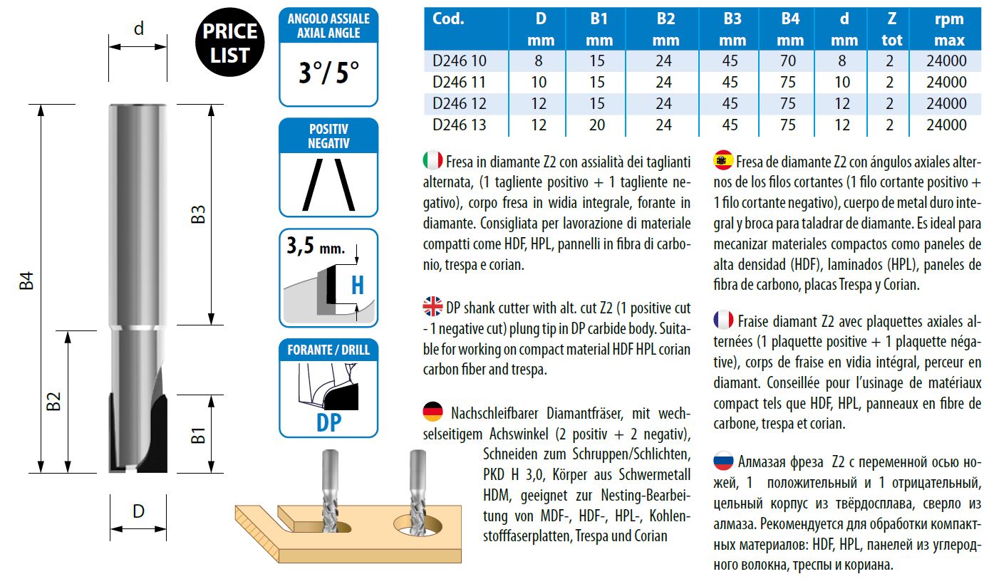 Potrivit pentru prelucrare panouri din materiale copacte tip HDF, HPL, Fibra carbon, Trespa, Corian.